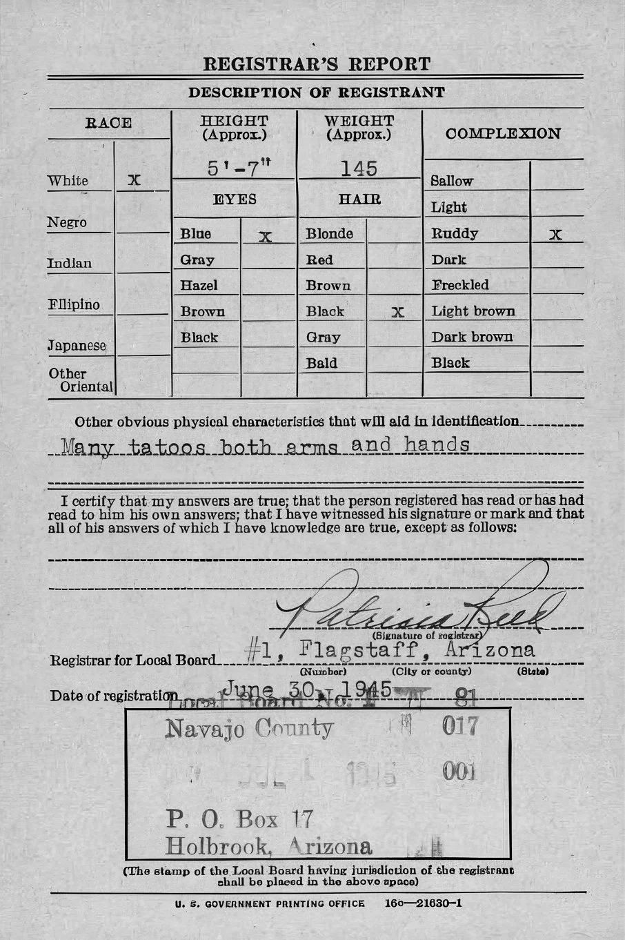 It was in such an informal environment that Lloyd, my grandfather, likely acquired his first tattoos. Records indicate that by 1945, despite being only sixteen, he was living in Winslow and already bore ink on his hands and arms. His draft card filed that June listed him as eighteen, a standard wartime fabrication. But the ink was unequivocally genuine. Even before he possessed the proper documentation, he had etched something permanent onto himself.